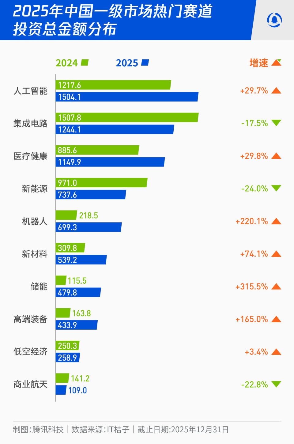 IT桔子的统计数据显示,2025年中国一级市场机器人赛道的投资数量由前一年的560起,增至714起,总金额更是由218.5亿元,暴增220.1%至699.3亿元,这一增幅远超人工智能、医疗健康、集成电路和新能源等热门赛道,增幅位列所有赛道第二(第一是储能),在所有赛道中资金规模位列第五。