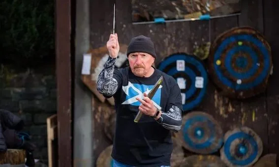 70岁的苏格兰老人Derek Hutchison退休前是一名市政负责贸易标准的公务员。62岁退休后,为了寻找新的消遣方式,他偶然发现了飞刀和飞斧这项运动。他介绍称,“退休后,我一直在找点事做,然后在网上看到了一段关于飞刀的短片”。这项运动的精准性和技巧性深深吸引了他,于是他买了一些基本的飞刀和飞斧,开始通过网上教程进行练习。这个时候他63岁。