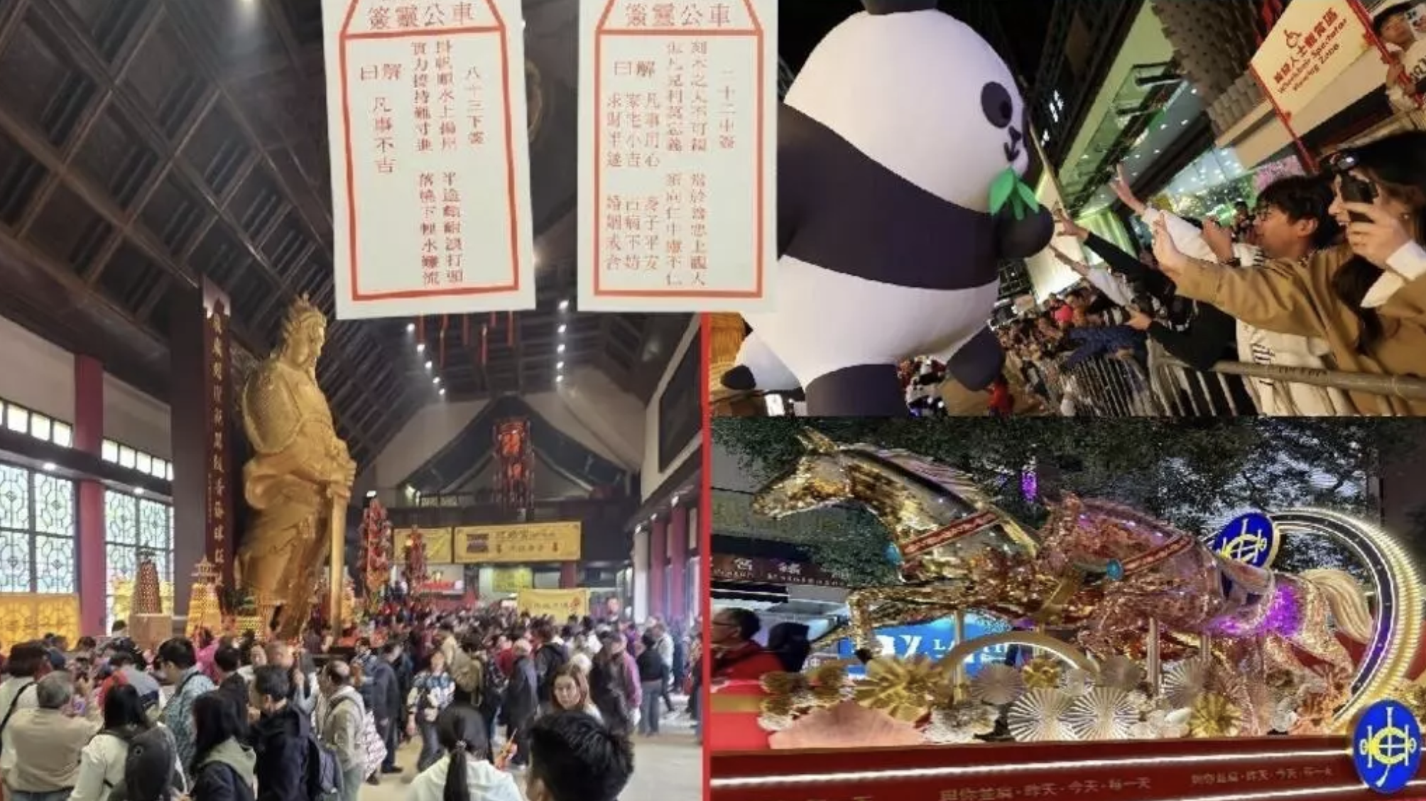 在港庆新岁可观赏花车巡游(图右),亦可到车公庙求签祈福(图左),但乡绅为香港和沙田分别求得中签和下签,如何解读却惹来热议。2026年2月18日 © 麦燕庭提供