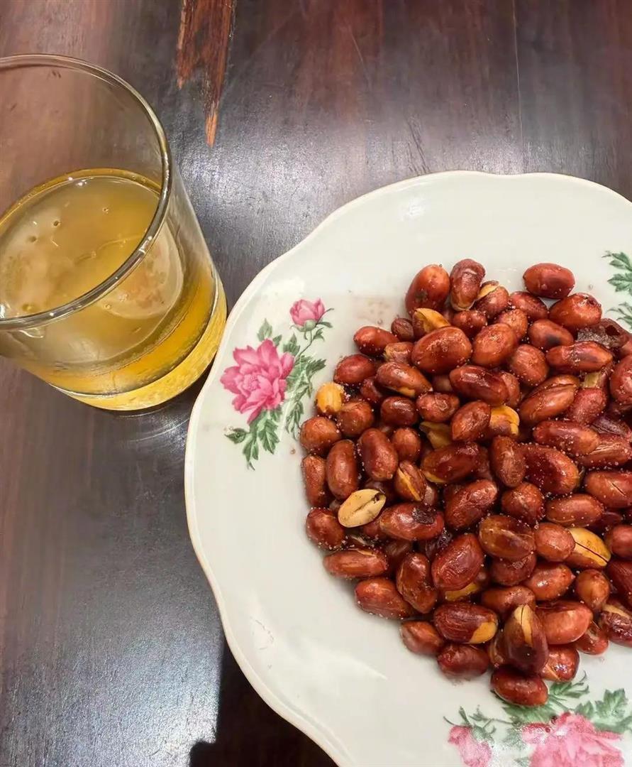 桌子正中央,立着一瓶飞天茅台。 酒瓶旁边,规规矩矩地放着两只小酒杯,不是一套的,就是家里随便拿出来的那种。酒杯边上,还有一小碟油炸花生米,金黄油亮。 这个配置太有故事感了,一瓶酒,两个杯,一碟花生米,怎么看都像是两个人的对酌。