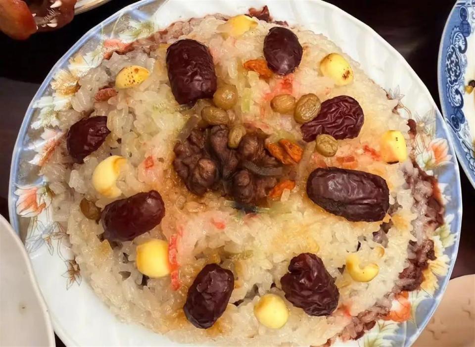 中午的镜头,切换到了甜食。 一碗白白胖胖的汤圆,在瓷碗里挤得满满当当,汤水清澈。旁边是一碟切成小块的八宝饭,糯米油亮,嵌着红枣和果脯。装八宝饭的碟子,是那种带点青花纹的老式款,边角可能还有一两个小小的磕痕,一看就是用了很多年的家什。上海人过年讲究吃汤圆,讨个团团圆圆的好彩头,她这顿午餐,规矩而传统。