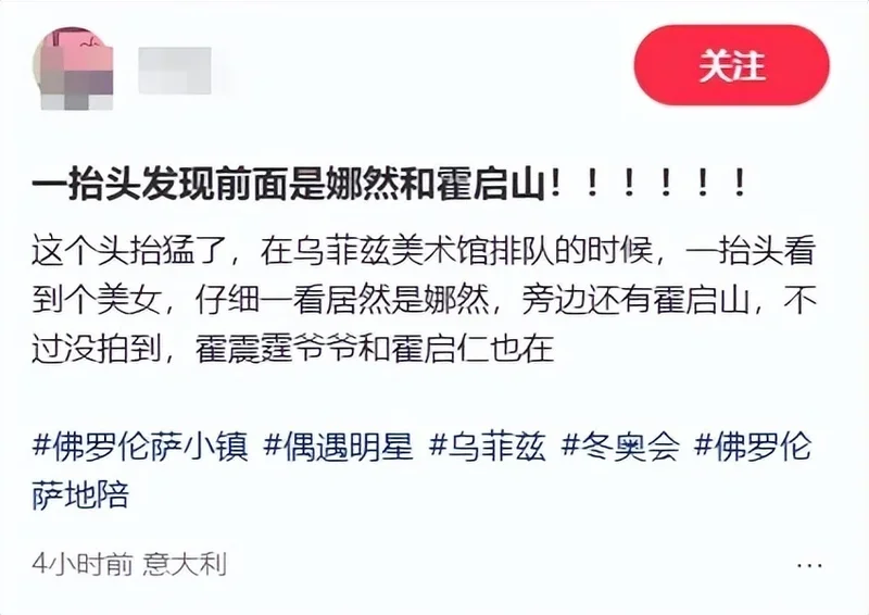 霍启山和娜然的恋情又有新路透了,有网友在佛罗伦萨偶遇两人一起现身美术馆,然后霍震霆和霍启仁夫妇也在现场。