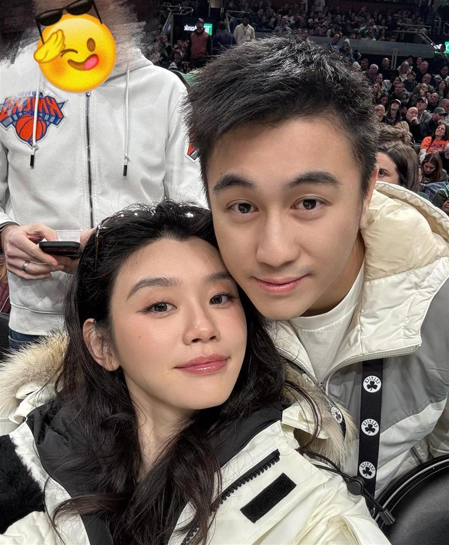 照片里,她和何猷君脸贴着脸,在NBA球场喧嚣的背景里旁若无人地自拍。
