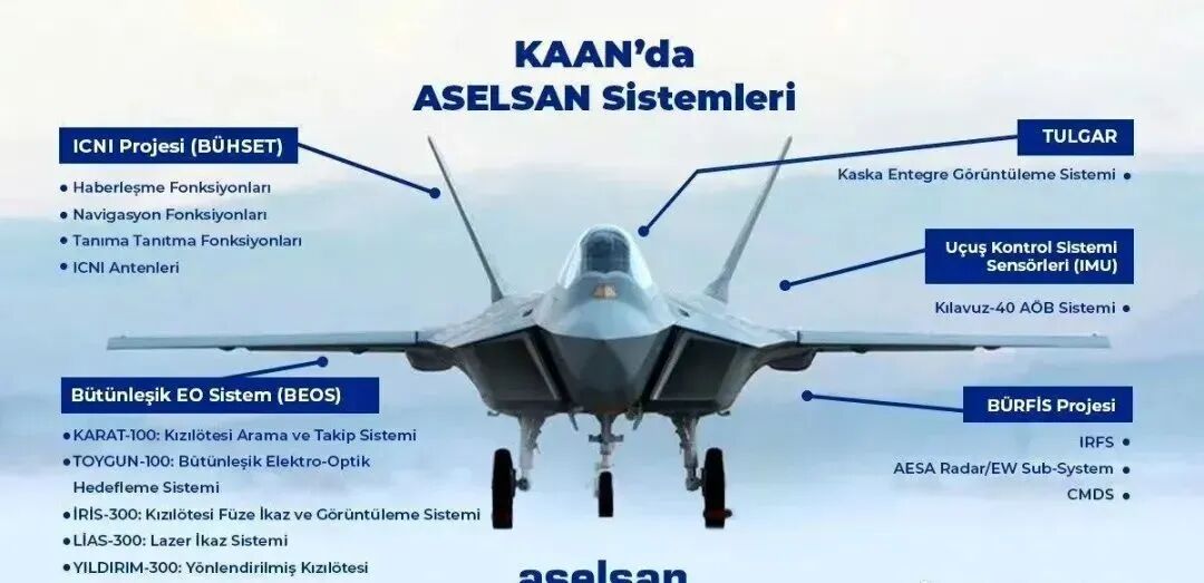 KAAN战斗机安装有ASELSAN公司的有源相控阵雷达、TÜBİTAKBİLGEM公司开发的MMU/TFX任务计算机、STC公司VSCF-LAD 208大面积显示器、ASELSAN公司TULGAR头盔显示器、ASELSAN公司KARAT-100对空红外搜索和跟踪系统IRST,IRST TOYGUN-100对地光电系统,ASELSAN公司的雷达告警接收器(RWR)、IRIS-300红外导弹预警、LIAS-300激光告警、YILDIRIM-300定向红外对抗系统、箔条和热焰弹管理、基于数字射频存储器(DRFM)的电子干扰系统。还具备人工智能能力,还将在以后的改型增加MUM-T(载人无人编队)功能。