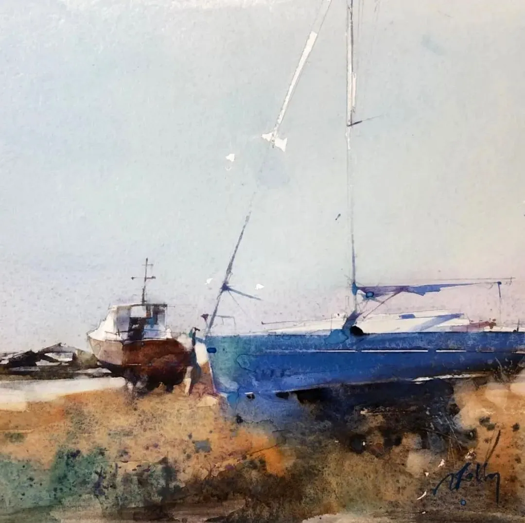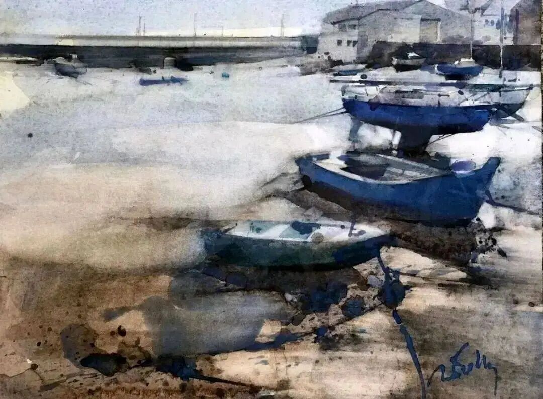 积水法,是水彩画中的“水之舞”。在纸面上局部铺陈大量清水,如同为颜料搭建了一个自由的舞台。随后,轻轻点入颜料,水便成了引导者,带着色彩缓缓流淌、汇聚,形成自然而不规则的积聚。