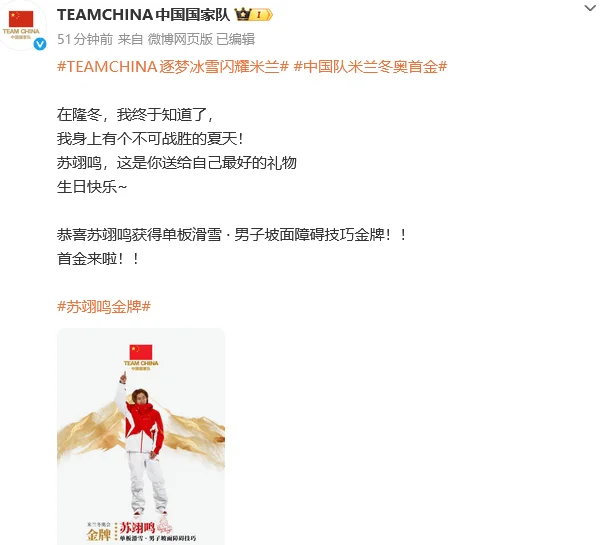 中国国家队发文祝贺苏翊鸣:生日快乐 首金来啦
