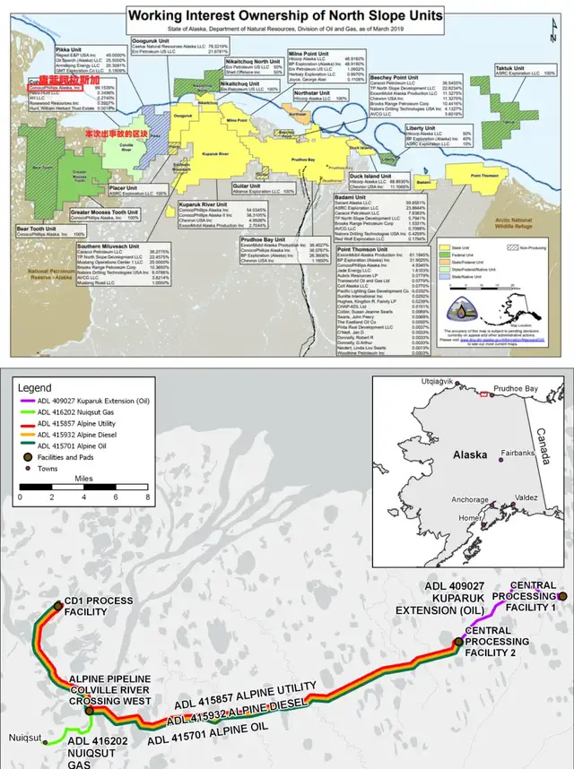 倒塌这地方的所在区块属于康菲石油,但在当地实际开发的乙方,其实是原住民,根据1971年《阿拉斯加原住民索赔解决法案》,资源收益归属原住民——阿萨巴斯卡人(早就不是靠打猎过活了)。
