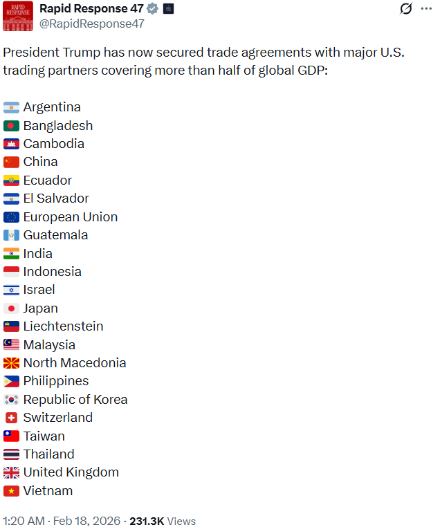 @RapidResponse47在X平台发文说“川普总统已经与美国主要贸易伙伴签署贸易协议,涵盖全球国内生产毛额(GDP)一半以上”。