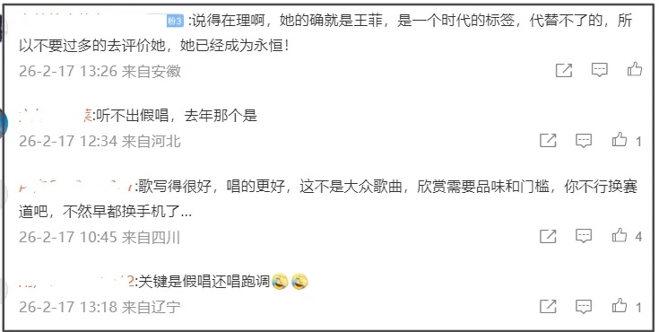 而还有部分网友因为王菲走音误认为她真唱,这也是许多观众的误区,常把难听当成真唱的佐证。