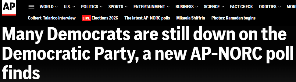 但热情不足可能成为该党长期面临的问题。2024年大选结束后,民主党人对本党的好感度大幅下滑,从2024年9月的85%跌至2025年10月的67%。尽管民主党在去年11月的选举中取得压倒性胜利,并在此后连续赢得多场选举,这种看法仍未恢复。其他民调显示,民主党人对本党普遍感到强烈不满。