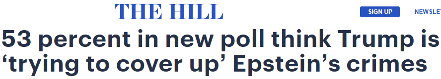 另一项关于近期备受关注的爱波斯坦案的最新民调显示,超过一半的美国人表示,他们认为川普正试图掩盖已被定罪的爱泼斯坦所犯下的罪行。
