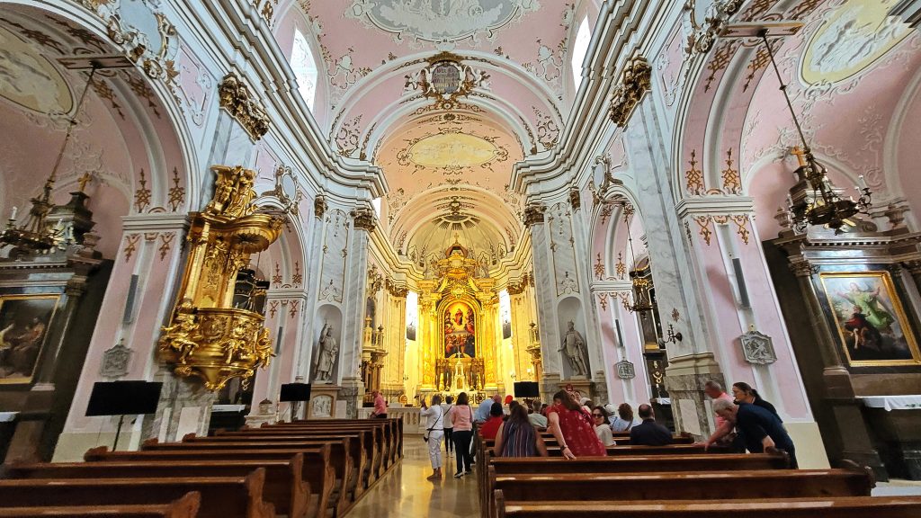 大教堂内部装饰独特,以淡粉色和白色为主色调。