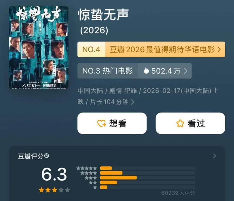 2月18日,让影迷多等了一会儿的《惊蛰无声》也收到了自己的豆瓣成绩单,不过,6.3分的开分表现让不少影迷表示意外。