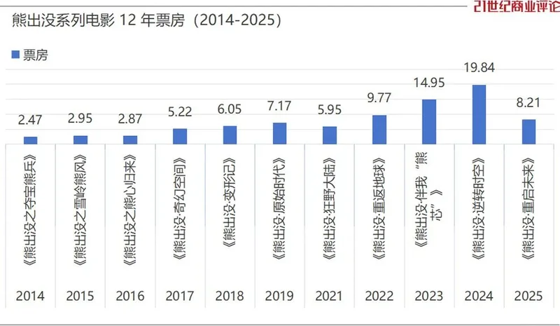 从那以后,《熊出没》以一年一部的节奏稳定推出电影作品。对许多家庭而言,每年春节带着孩子走进影厅,观看一部新的《熊出没》,如同顺手买的一件年货,即便没多少惊喜,也总不会买错。