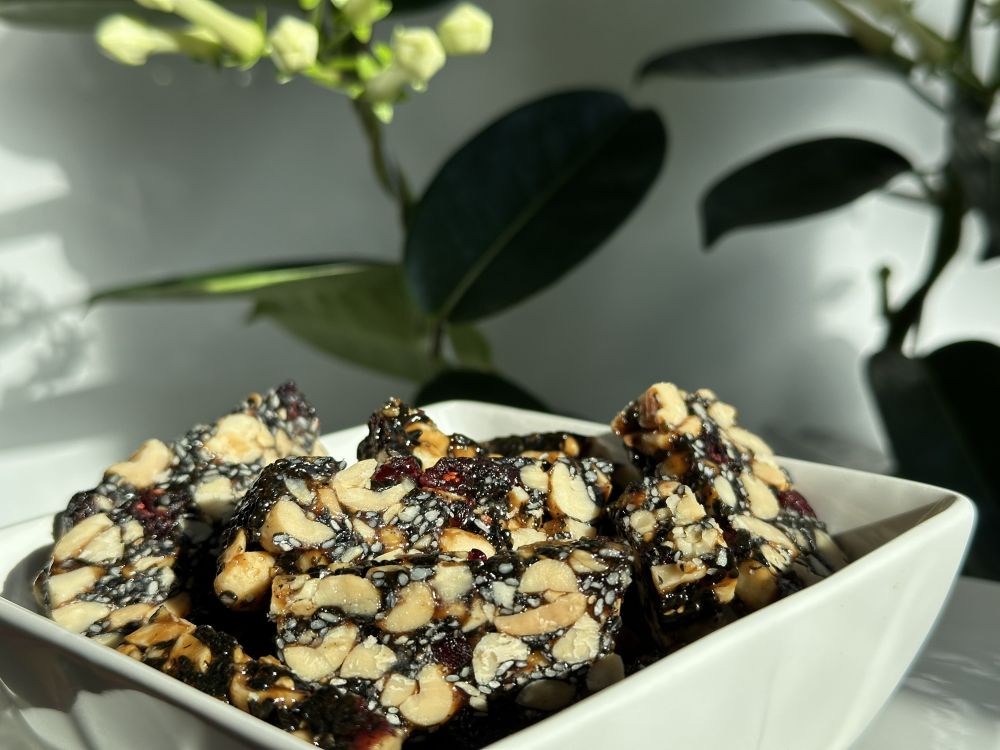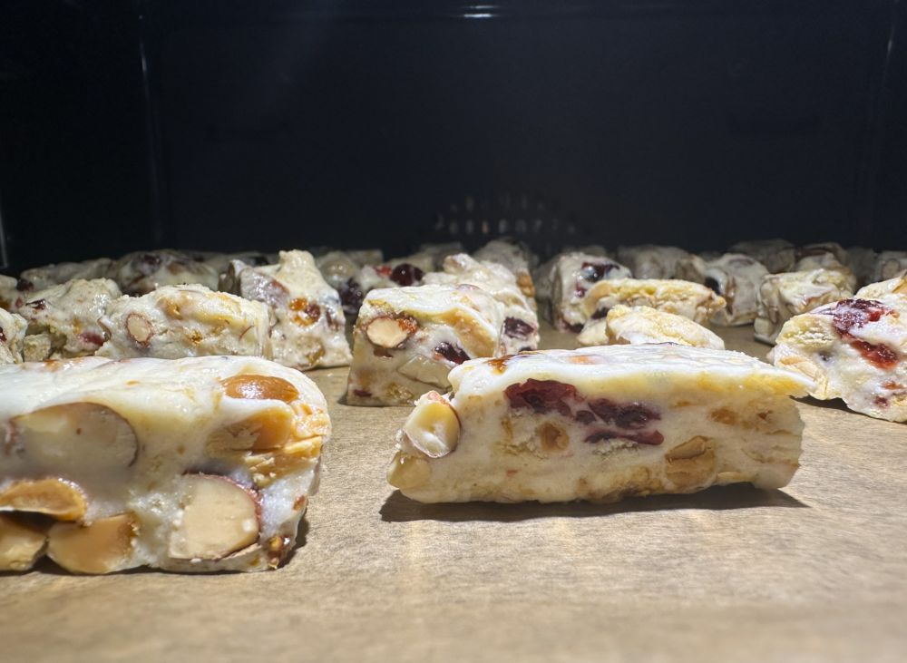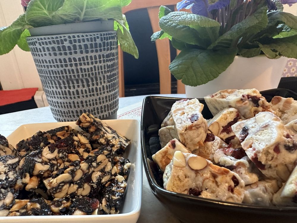 第一道的年味儿就从芝麻糖开始吧。黑芝麻,花生炒香,碾碎,倒进熬制的麦芽糖浆里,再整理成形,切块儿,芝麻混着焦糖的香味就溢满了厨房。