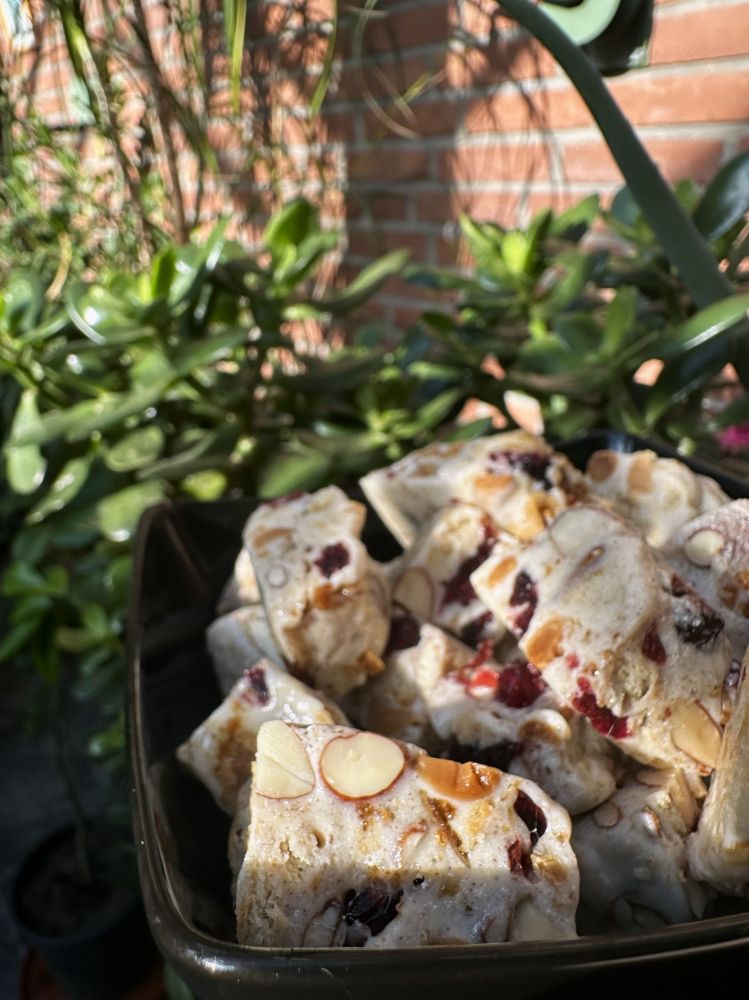再来是牛轧糖,这要晚一些才来到我的记忆里。当年是爷爷的同事从上海带过来的,乳糯甜蜜的口感,一口咬下去,确实比我们的水果杂拌儿糖要幸福了许多。那会儿都舍不得吃完一整颗,用糖纸包好剩下的半颗,揣进兜里,把快乐攒着,留到下一次。