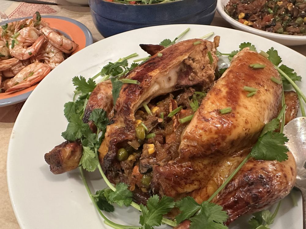 八宝鸡,把各种食材和泡好的糯米翻炒焖煮,填进腌制的鸡肚子里,或蒸或烤,让八宝饭沁着鸡汁儿的香味出炉。