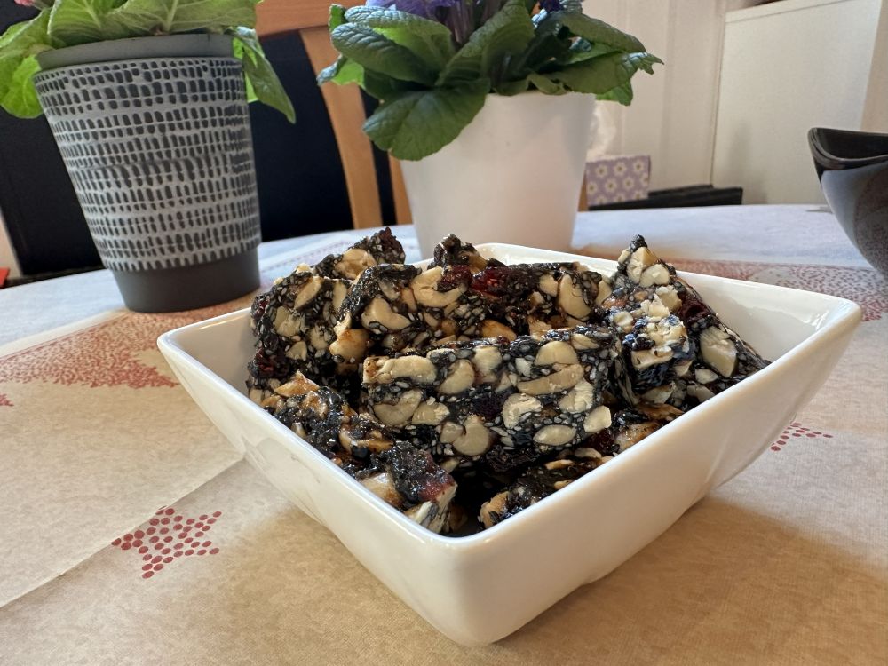 黑芝麻的切面粒粒分明,加上蔓越莓干的红色点缀,甚是香甜。