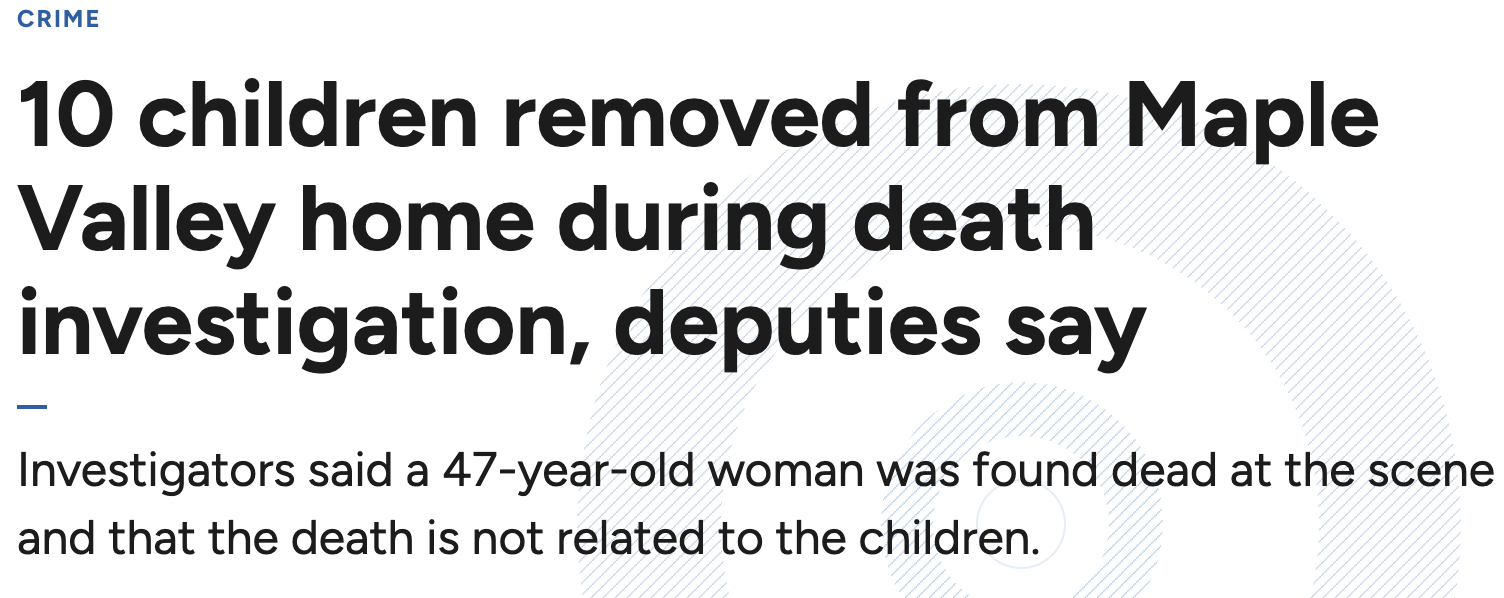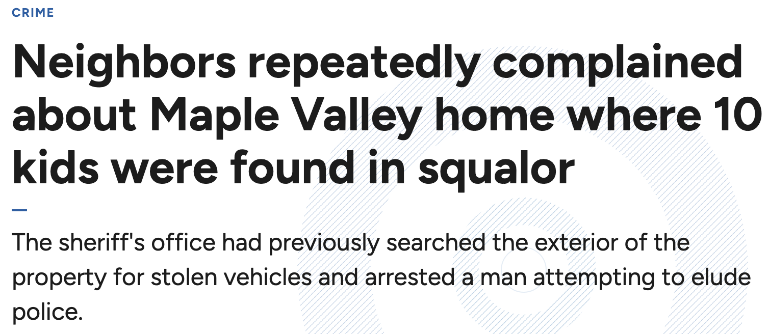 华盛顿州Maple Valley一处住宅近日暴露出骇人现实:金县警长办公室在处理一起疑似死亡报警时,发现屋内有10名年龄介于1至10岁的儿童生活在极其恶劣的环境中。孩子们被转入保护性监护,DCYF已确认案件涉及严重儿童虐待案件。