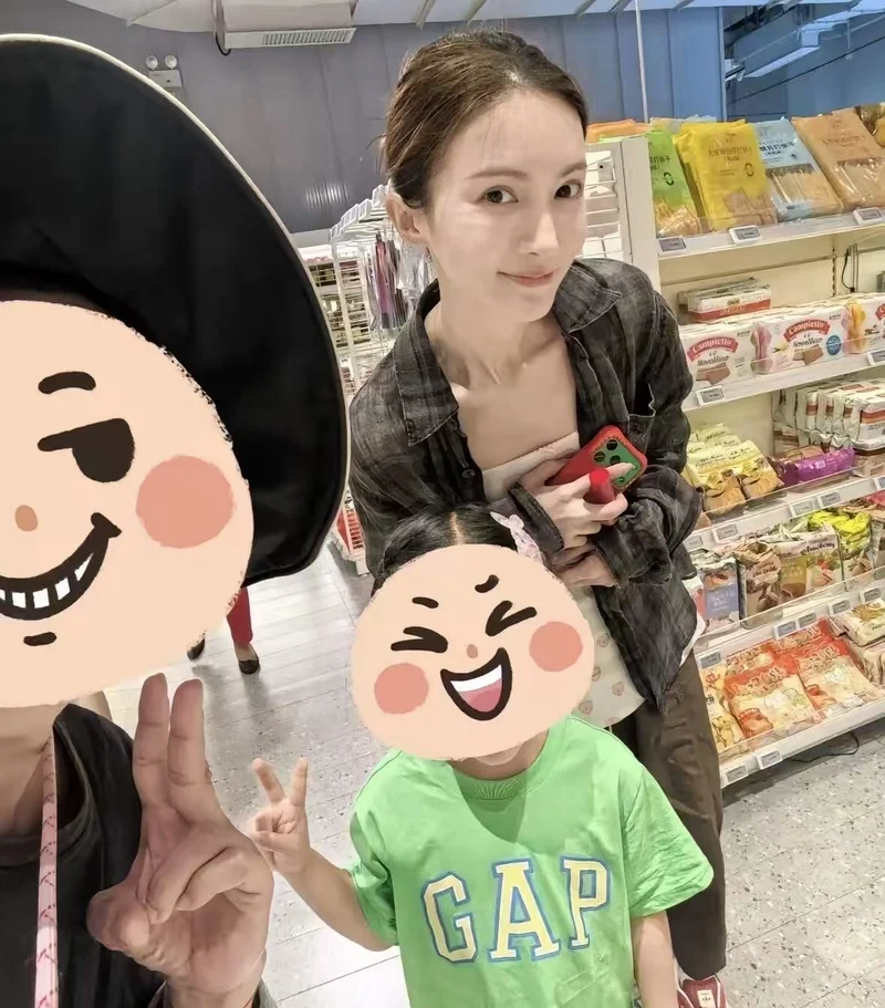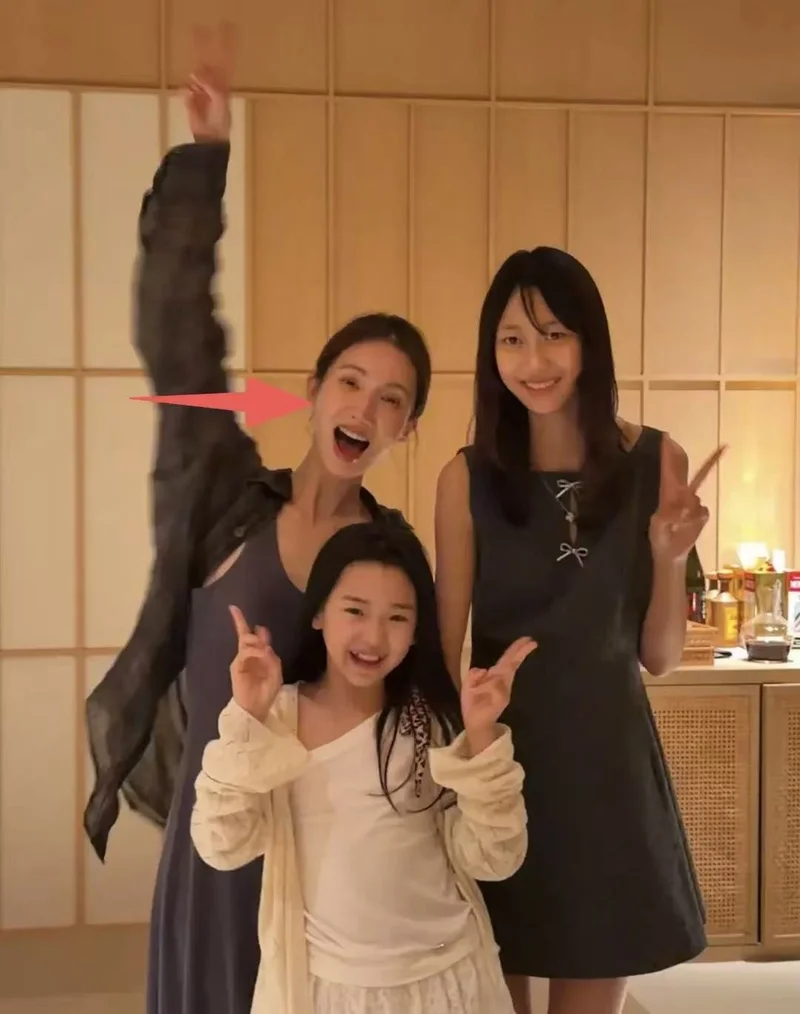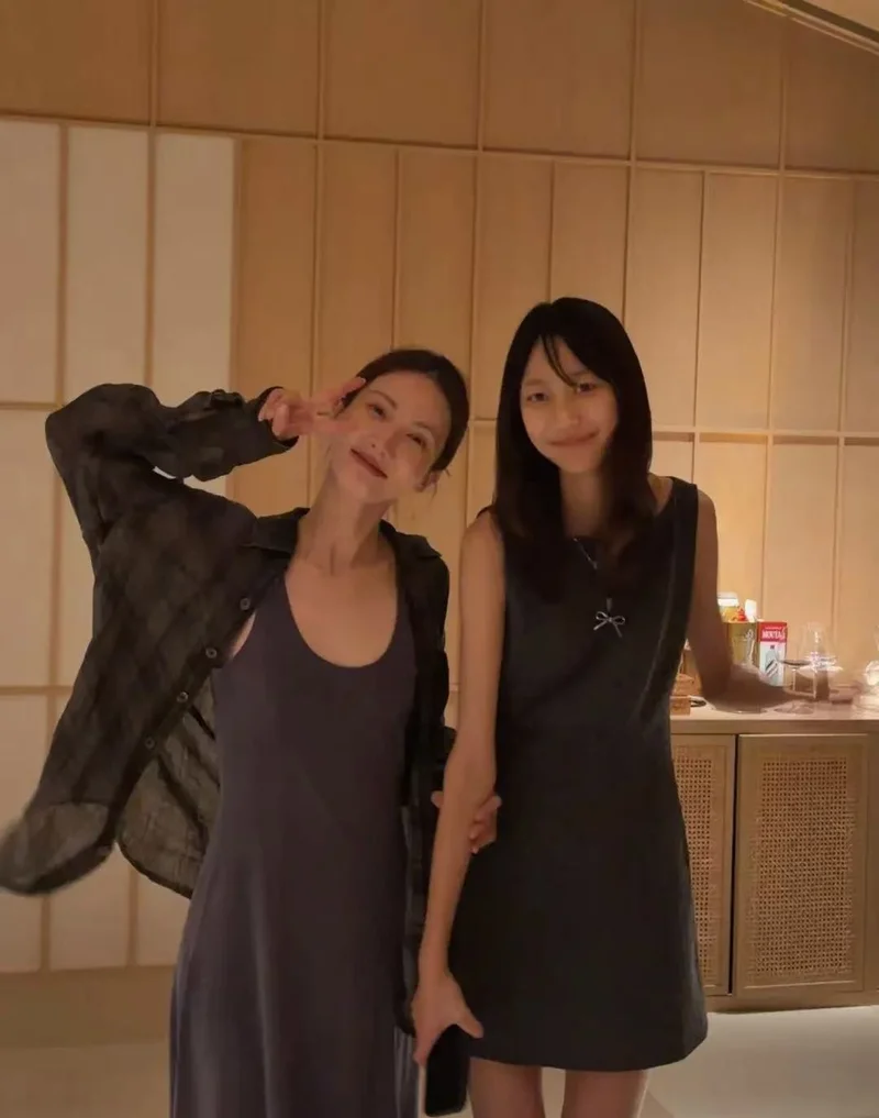 金晨拉着董璇闺蜜的女儿合影,她换的一条吊带长裙很适合她,高高瘦瘦的,练舞的身材线条就是好看。