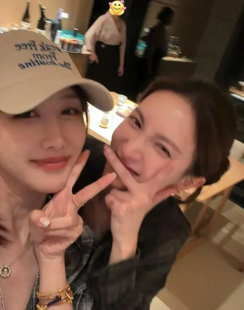 喝嗨后,金晨人也放开了。跟董璇闺蜜合影时脸红彤彤的,对着镜头开心比耶。她们身后还有好多酒,看样子是某个会所里聚会。