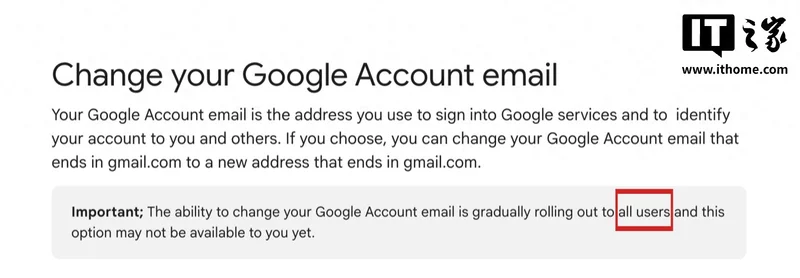 谷歌在去年 12 月悄悄更新支持页面,透露正在灰度测试允许部分用户更改谷歌账号 @Gmail.com 电子邮件地址前缀,不过当时相应说明文档仅提供印地语版本,因此外界认为这可能只是一项临时性的测试。而如今,谷歌已全面更新说明文档,正式确认相应功能“正在逐步向所有用户推出”,需要一段时间才能覆盖全体用户。