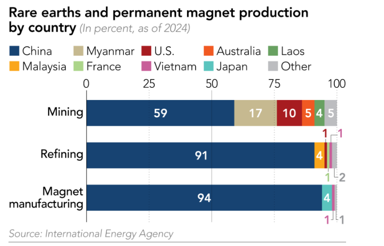 中国占全球重稀土,钕、镨、镝和铽开采量的60%,并精炼全球90%的供应。中国还是全球最大的重稀土永磁体供应国,占全球产量的94%。
