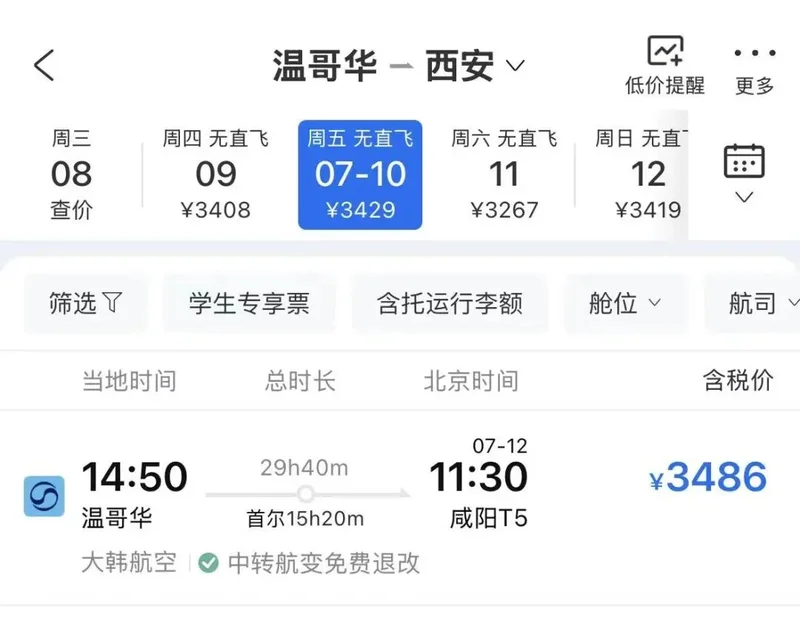 说到国外转机,大韩航空从温哥华出发经首尔转机飞西安,税后价格¥3486元。