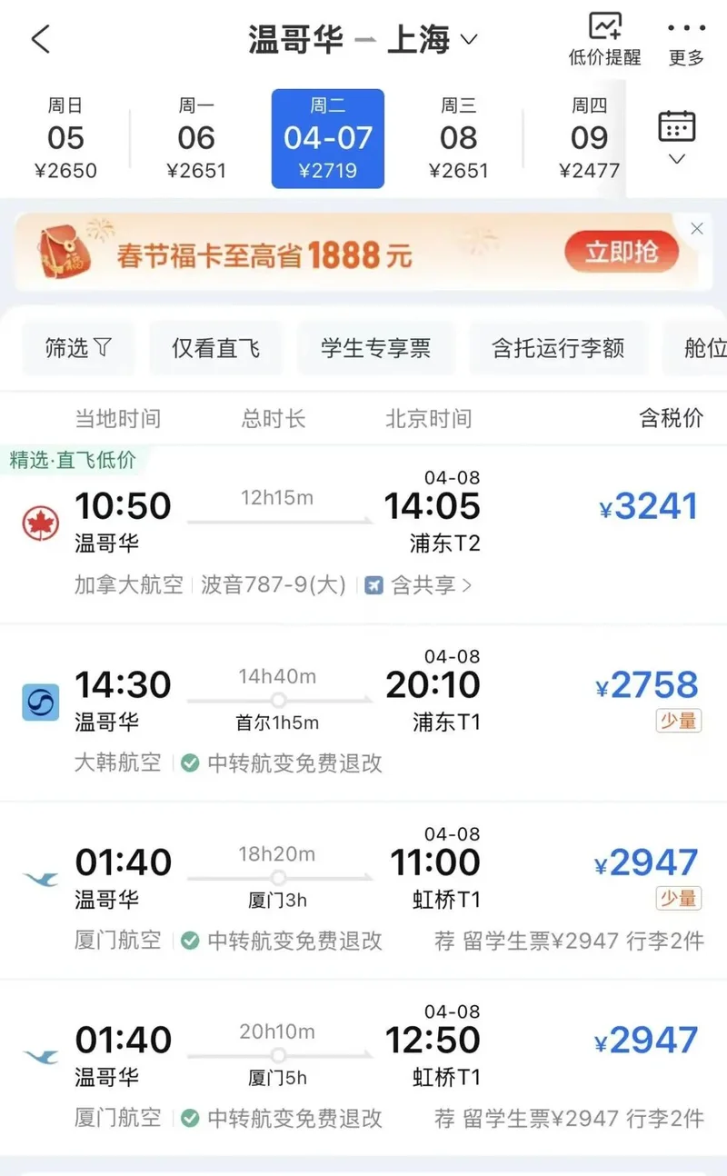 比如说,4月7日温哥华经厦门转机飞上海,税后价格¥2947元,折合加元580多,还含了2件托运行李。