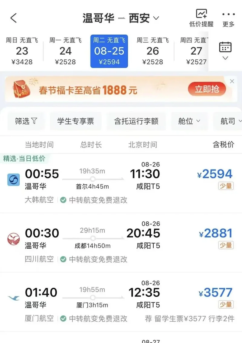 还有8月25日,温哥华飞西安的,川航的才¥2594元。