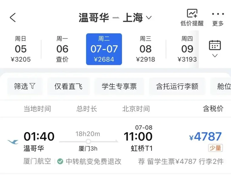 7月7日暑假高峰期,温哥华出发经厦门转机飞上海虹桥,税后价格¥4787元,含2件行李。尽管从日本韩国转机票价更便宜,但大多不含托运行李。而且,这个价格在暑假期间已经是相当亲民了。