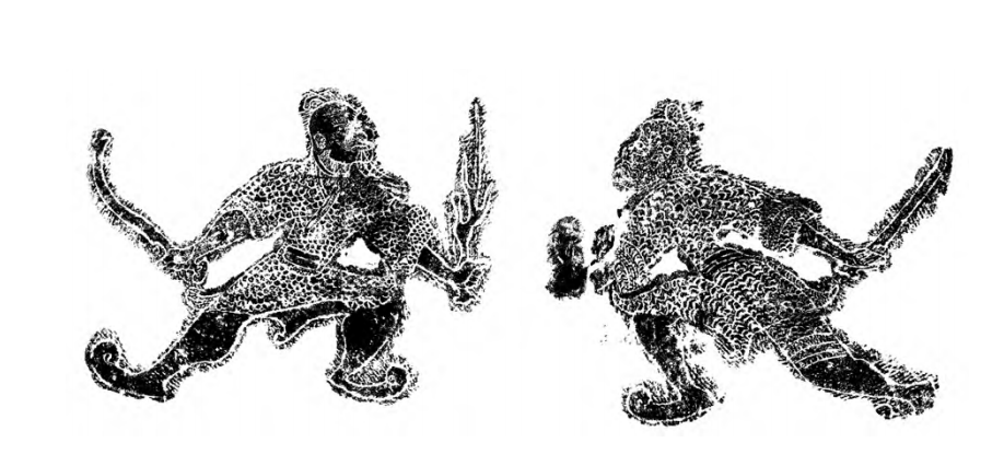 不仅过年时百姓张贴二神,就连人去世以后,镇守墓道大门的守墓神也是神荼、郁垒。这是他们和今天的门神最大的不同。比如,1937年考古工作者在山东曲阜发掘了一座古墓,墓中除了墓主人石棺椁之外,人们还发现有两幅壁画,刻画在棺椁南壁外侧。画像无边缘纹饰。画的主题是两个人,弓步相对,目眦欲裂,孔武有力。左边的人物右手手拿曲棍状物品,左手拿着树枝样物品(应当是桃树枝)。右边的人物,左手前伸,右手持刀。学者们推测此墓的年代当为西汉末至东汉初。