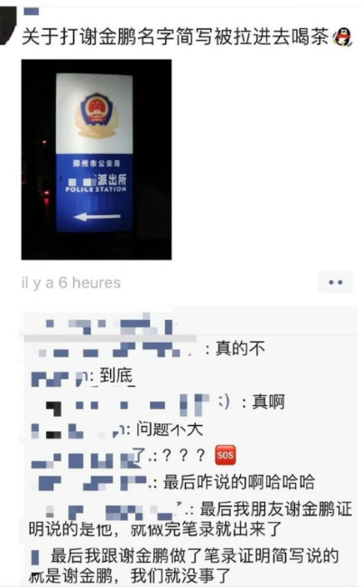 有中国网民在海外社交平台上发帖爆料称,今年除夕这天(2月16日),一位中国网民在网络社交平台上与他人聊天时,提及朋友“谢金鹏”的名字用了首字母代替,不想竟然因此被公安盯上,稍后就被带去派出所做笔录。对于这位网友的解释公安不信,最后该网友只好让名为“谢金鹏”的朋友亲自到派出所作证,确认前者聊天时所提到的是本人而非习近平,被抓的网友才得以脱身。