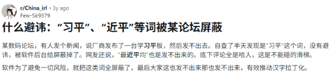 稍早,还有网友在美国社交平台Reddit上发帖爆料称,在某数码论坛上,有人发一则新闻,说厂商发布了一台学习平板。结果死活都发不出去。自查了半天才发现是“习平”这个词没有避讳,被软件后台屏蔽了。网友还说,“最近平均”也是发不出来的。网友调侃说,软件为了避免一切风险,就把这类词全屏蔽了,最后大家这也发不出来那也发不出来,“有效推动汉字拉丁化”。