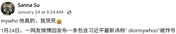 此前,一个网名为“Sanna Su”的中国网友曾于1月24日在海外社交平台发帖爆料,称一位朋友因在微博发了一条包含被认为是习近平最新讳称的贴文被炸号,违规原因是“涉时政类有害信息”。