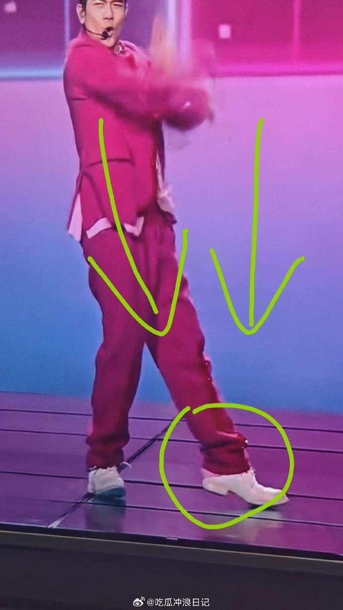 然而,接下来的几秒钟,才是见证真正功力的时刻。鞋子脱落瞬间,郭富城面不改色,凭借超过四十年的舞台经验,上演了一场教科书级别的“隐形救场”。他借着身旁舞者的身体遮挡,以一个流畅的舞蹈动作为掩护,脚腕巧妙发力,仅用几秒钟就迅速将鞋提起并穿好。整个过程行云流水,不仅现场观众毫无察觉,连直播镜头和与他同台表演的王一博都未曾发现任何异常。这一细节,直到网友反复慢放高清视频,才被“侦破”出来。