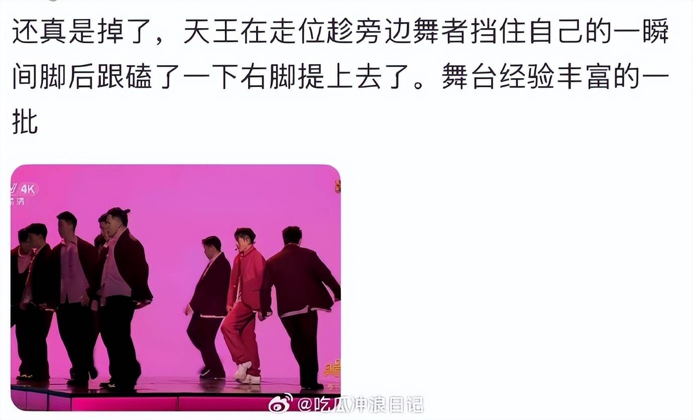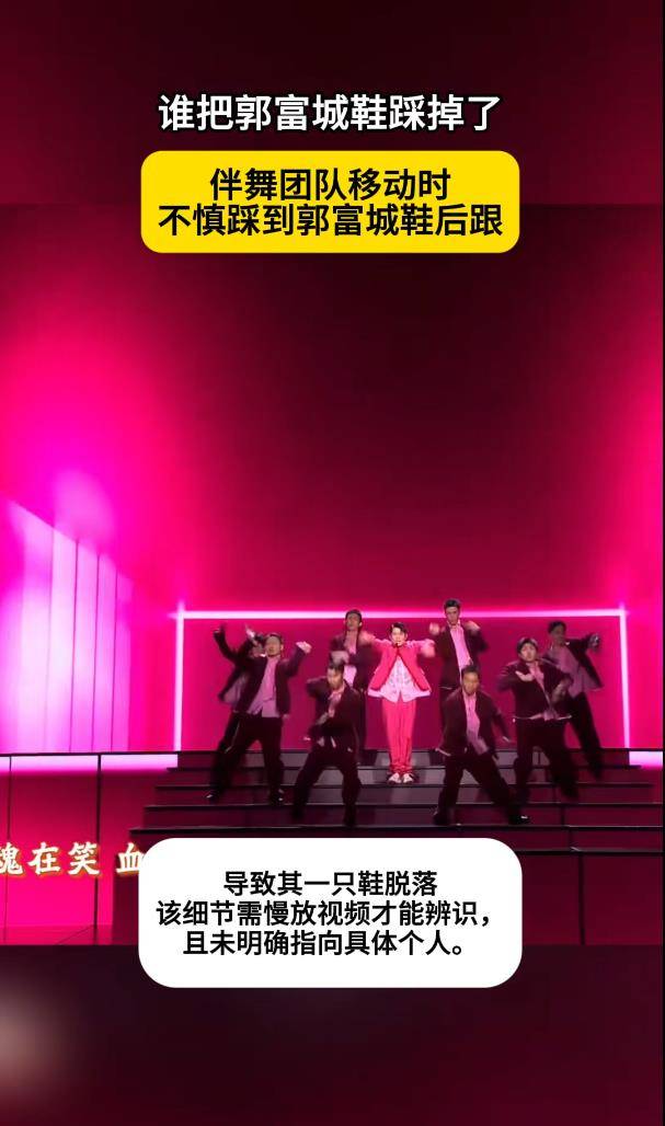 这一幕迅速引爆网络,“谁把郭富城鞋踩掉了”火速登顶热搜。据还原,在舞蹈动作最激烈、队形变换最频繁的环节,一名伴舞成员因走位不慎,一脚踩在了天王的鞋后跟上,直接导致鞋子脱落。这并非指向某个人的失误,更像是高强度舞台协作中难以完全避免的意外碰撞。