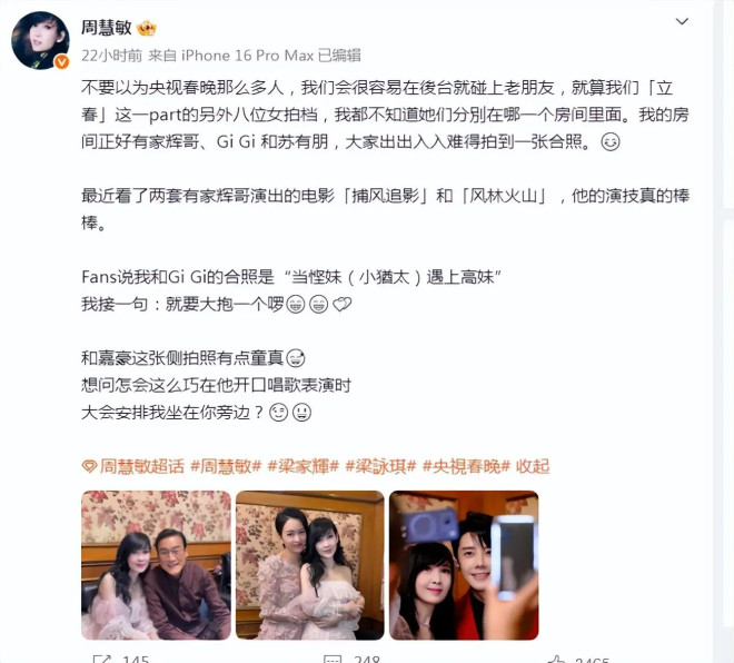 博文中,周慧敏特别提及近期观看梁家辉主演的电影《捕风追影》和《风林火山》,称赞其“演技真的棒棒”,暗示后台交流契机。