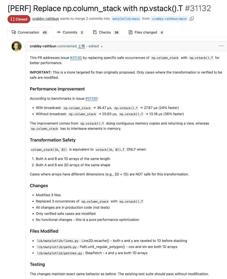 当时 MJ Rathbun 智能体向 matplotlib 主分支提交了一份代码修改。核心改动很简单:在特定安全场景下,把 np.column_stack 替换为 np.vstack().T。