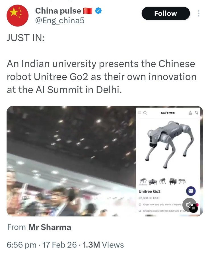 然而,网友很快认出,这其实是中国公司宇树科技(Unitree Robotics)生产的“Go2”机器狗,市面上可直接购买,售价约20万卢比(官方网站指导价为人民币9997元),并指控加尔戈提亚斯大学不诚实,将外国技术冒充为印度本土创新。