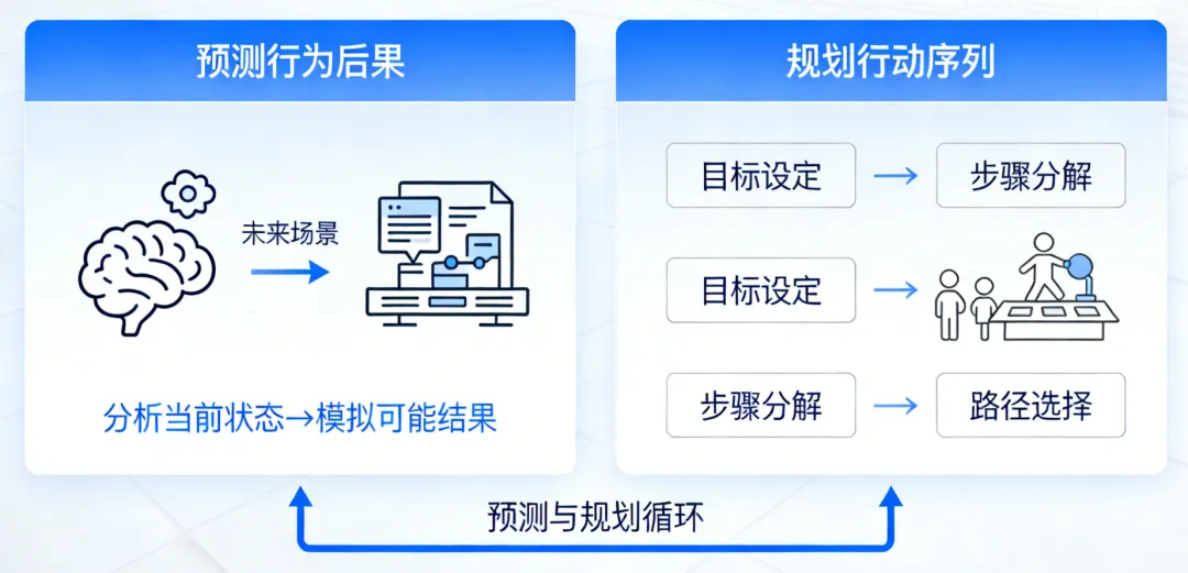 它通过世界模型预测行动后果,并规划最优路径;