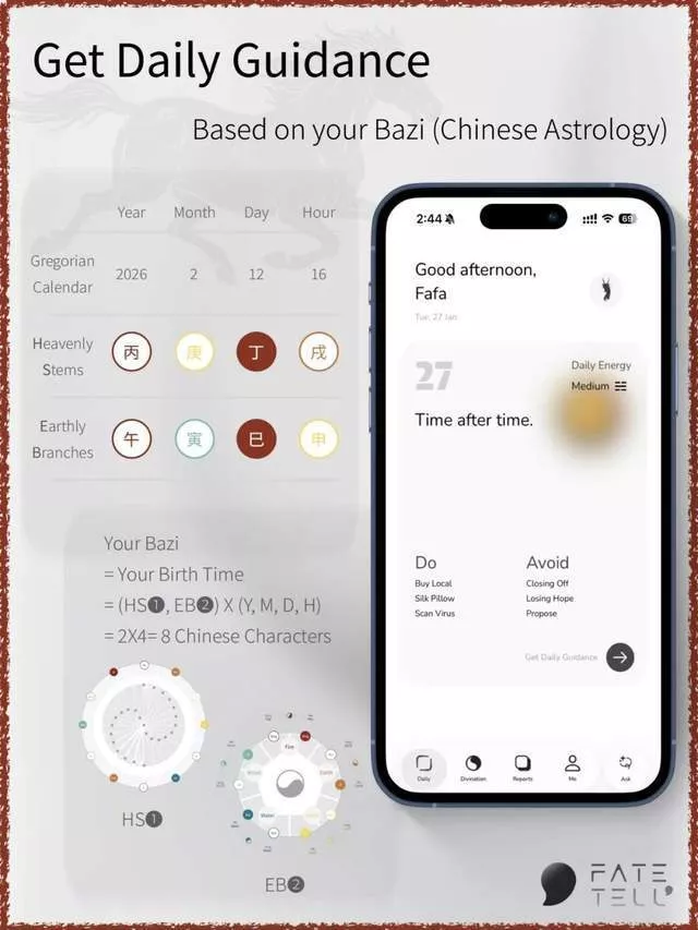 FateTell是其中的代表。以生辰八字为切入点,主要产品是“命之书”(提供超万字报告、AI解读)和“运之书”(聚焦运势波动)。