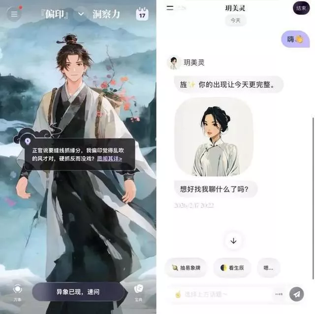 问玥与万象有灵的产品逻辑较为相似,均以精致虚拟人格为交互载体,弱化命理属性、强化陪伴体验。两者的使用体验与通用大模型十分接近,都是以聊天形式展开,区别在于增加了虚拟人物载体,让陪伴感更直观、强烈。
