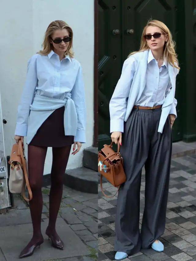 确实衬衫很百搭,不管你如何组合都很好看,偏爱干练风可以换成最经典的灰色西装阔腿裤,脚踩雾霾蓝的浅口单鞋,正好和雾霾蓝的衬衫形成呼应。