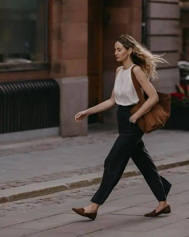 或是选择一双棕色的皮鞋来搭配上黑色的西装裤,这样的色彩组合能打破整体打扮的沉闷与枯燥,显得更精致又显贵。