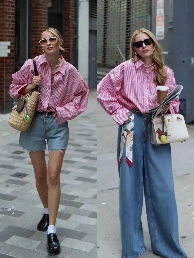 就算是同一款衬衫,当下装不同,气质自然也会得到改变。就比如这一件粉色的条纹衬衫,搭配牛仔短裤,就能形成下衣失踪穿法,呈现出长腿的优势。