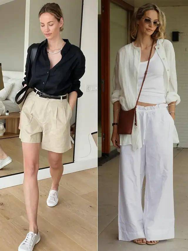 当然啦,想要休闲风的女性,我们同样还可以用帆布鞋或者是小白鞋,当你穿在脚上,让整体打扮就会偏休闲风,例如上面用黑色的衬衫搭配上卡其色的百慕大短裤,整体打扮简约耐看。