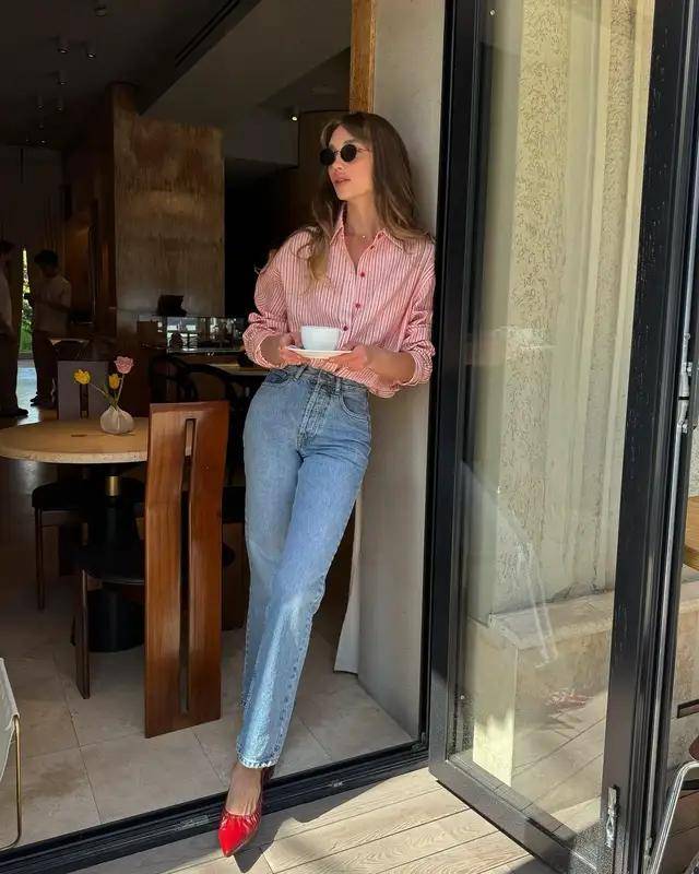 当然了,一身好看的穿搭少不了一双适合自己的鞋子。当我们选择粉色衬衫搭配上经典的蓝色牛仔直筒裤,脚上可以选择红色的浅口高跟单鞋来搭配,红色的鞋子点缀整个造型,让穿搭者看起来更有活力。
