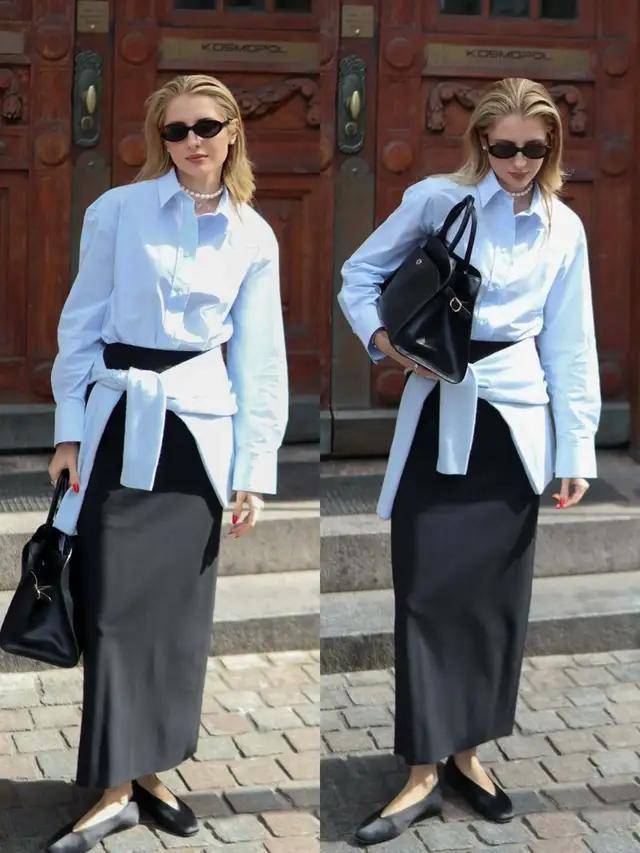 比如上面这一条灰色的直筒半身裙搭配上雾霾蓝的衬衫。脚踩一双黑色的玛丽珍鞋,整体造型优雅得体,轻松穿出不费力的时尚感。