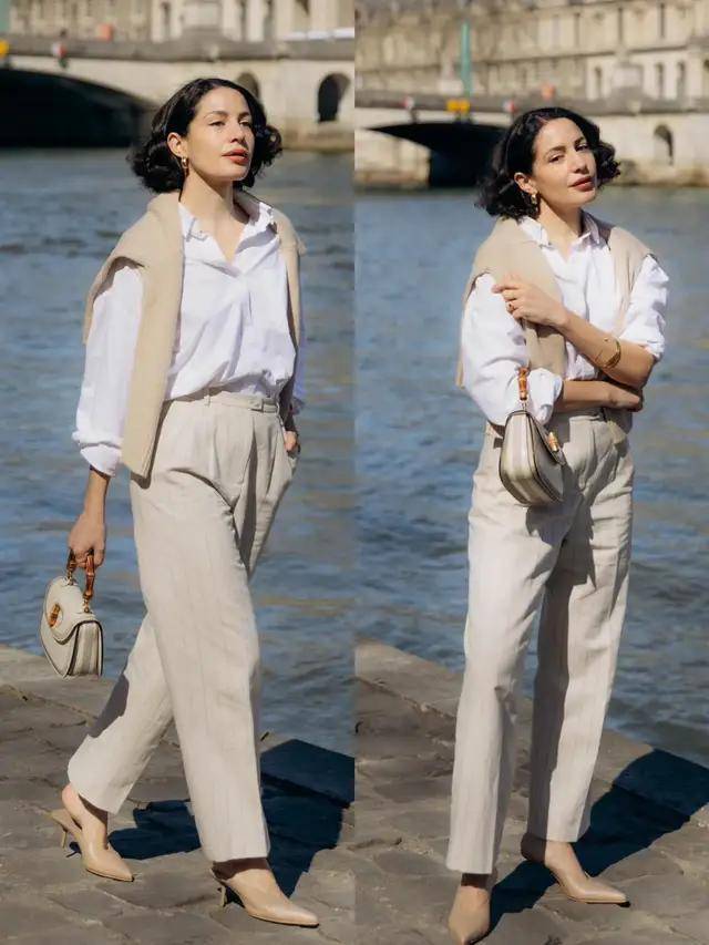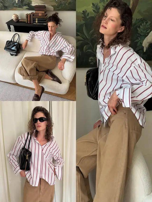 白色衬衫经典耐看,搭配上一条条纹的浅卡其色西装裤,简约高级又百搭,过年穿体面又好看,很适合奔三奔四的女性。